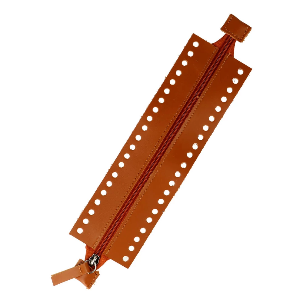Nagyobb horgolt neszeszer vagy kézitáska méretű táska látványos kiegészítője hosszú bőrcipzár. 100% magyar kézműves termék, valódi bőrből készült, tartós darab. Kúszószemekkel könnyedén a táskádhoz horgolhatod. A cipzár teljes hossza 26 cm, a horgolható rész 24 cm. Limitált darabszám!