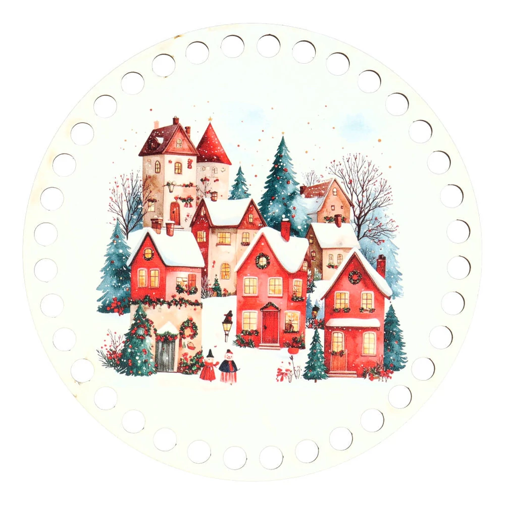 Színes horgolható alap karácsonyi falu motívummal kopogtatókhoz, kosártetőhöz