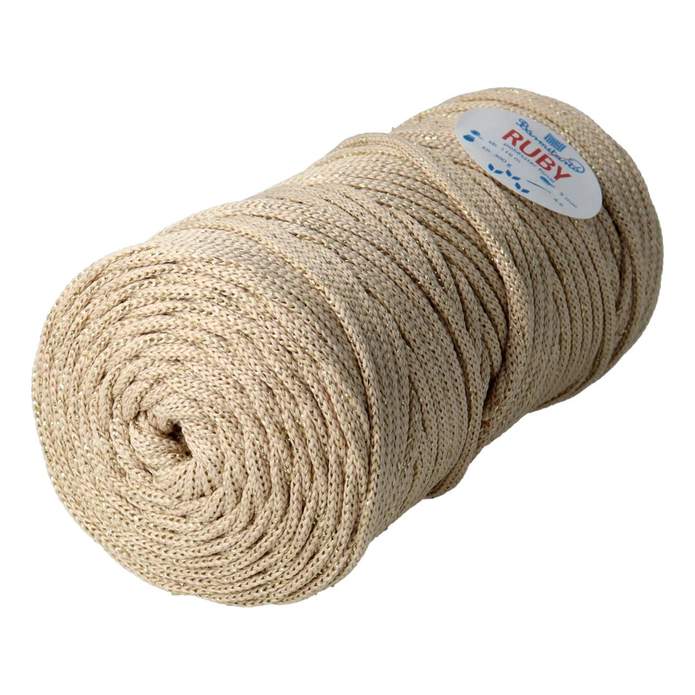 Az arany szállal átszőtt bézs RUBY GLAM gombolyag csomómentes és egyenletes. Horgolt soraid rendezettek, szemet gyönyörködtetőek lesznek a zsinórszerű, lapos fonalszerkezet miatt. Amikor kézbe veszed az arany szállal átszőtt bézs RUBY GLAM fonalat, egy elegáns felületű, puha tapintású, természetes hatású gombolyagra számíts.